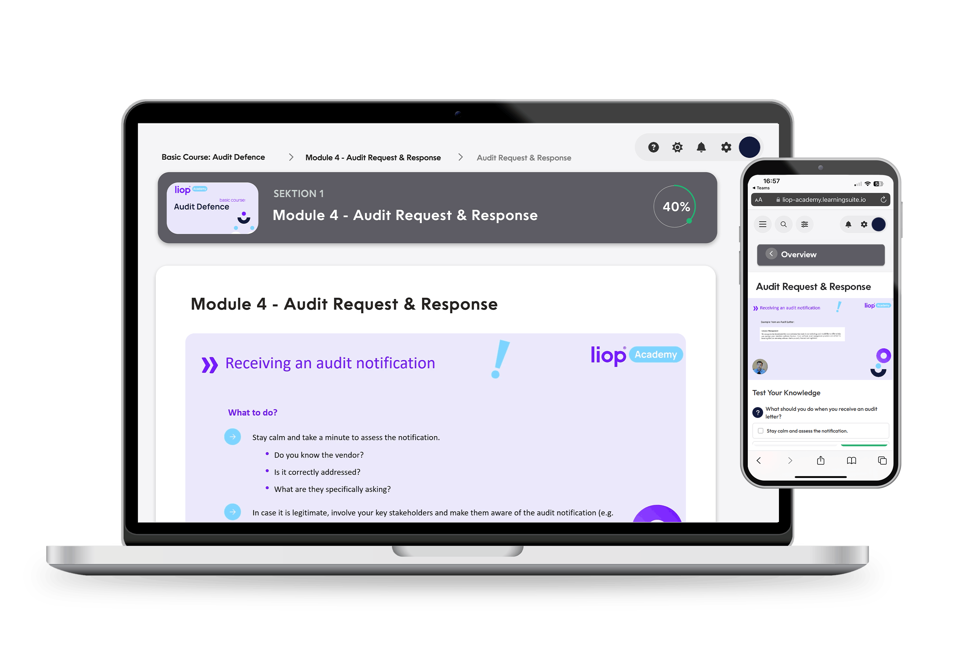 - Communication and evaluation: You will be trained on how to effectively communicate the audit results and assess them internally to implement improvements and strengthen your compliance in the long term.