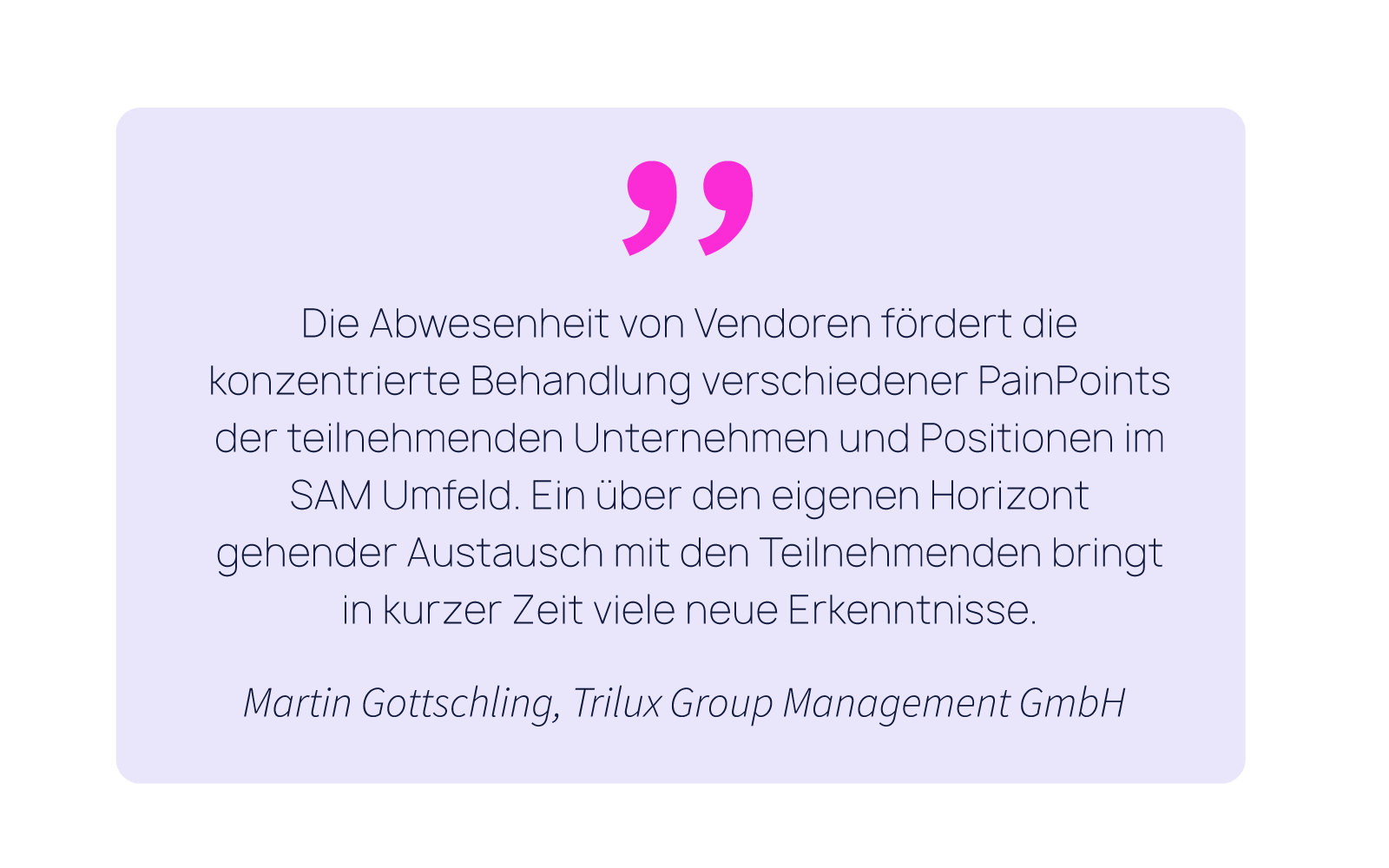 Keine Sales-Pitches, keine Sponsorenstände – anbieterfrei und herstellerunabhängig. Neutrale Expertise und Praxiswissen aus ITAM/SAM & IT-Einkauf für bessere Entscheidungen. Die „harte Tür“ der liop days: Rein kommt nur, was der Praxis wirklich nützt.